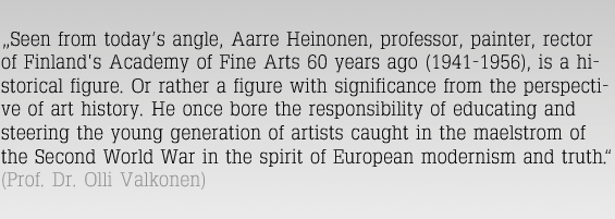 Aarre Heinonen's own development stemmed from his difficult career, so characteristic of multitalented people. His music studies in Vyborg and Helsinki had qualified him as a music teacher and he was also an accomplished pianist. His long-term interest in painting, however, eventually won. His painting studies proper started after his first solo exhibition at the age of 25 in the drawing hall of the University of Helsinki under the guidance of Väinö Blomstedt. The Ateneum's Academy of Art was not an option for him at that time but he went on - just like Edelfelt - to the Antwerp Royal Academy of Fine Arts 1935-37 and thereafter to Paris. Heinonen's career development marked a departure from the attitude then prevalent among young artists who feared that too much "academia" poised a threat to their freedom of artistic expression. The pressing question was, as ever, how the artist's training or art education should be organised to better correspond to its purpose.